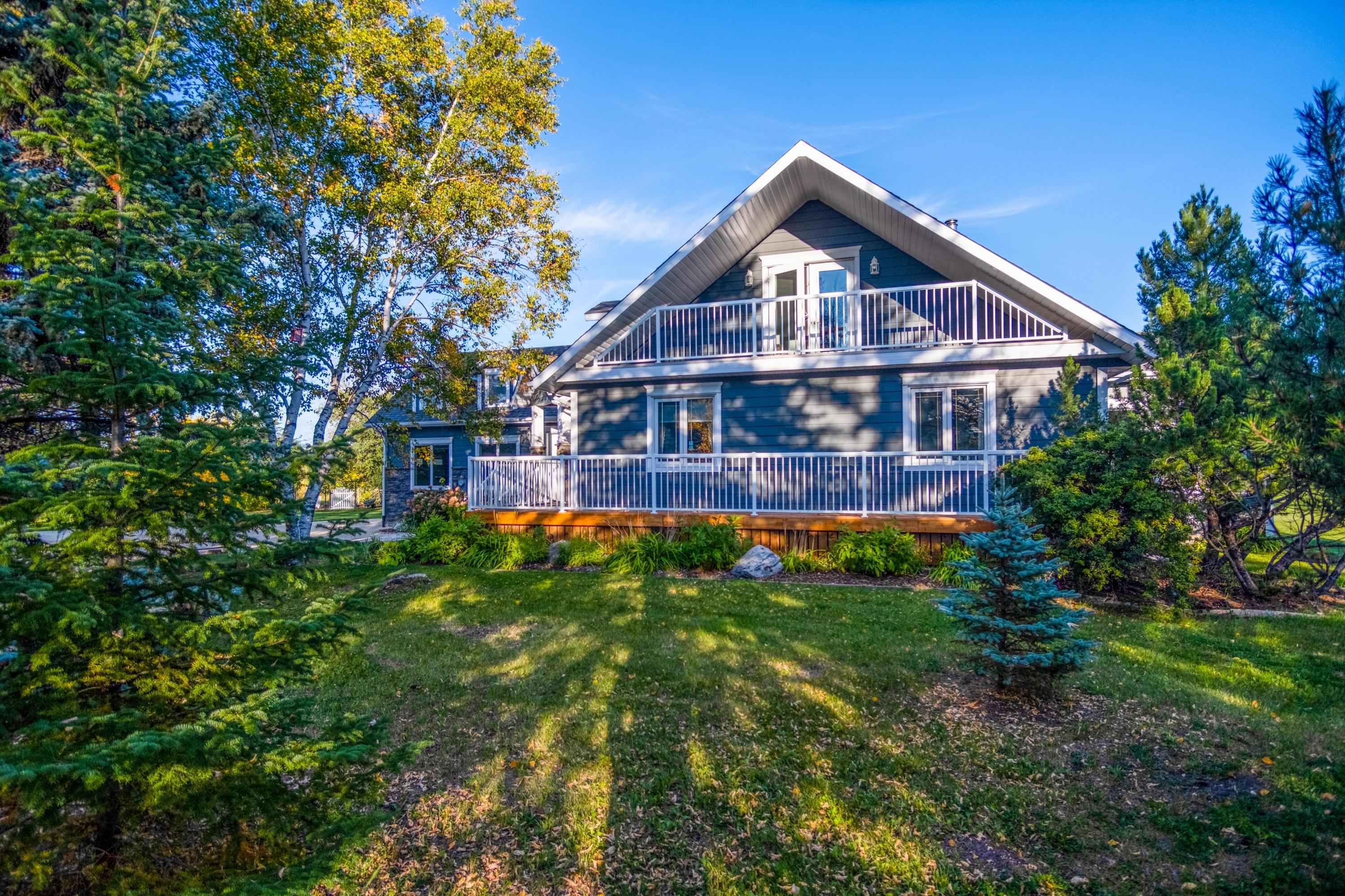The main floor further offers a guest bedroom, a 4-pc main bathroom with corner jetted tub, a huge mudroom with access to the oversized double, fully finished garage with Hormann doors, as well as private studio/office/bedroom with patio doors to the attached cedar deck. Hardwood flooring throughout the home plus heated tile and heated marble floors in the entries. The second story features two additional bedrooms, a walk-in closet, 3-pc bathroom, and access to the covered balcony off one of the bedrooms - facing west ... stunning sunset views guaranteed!